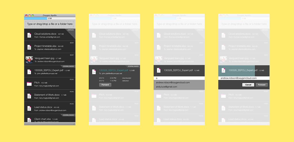 LeapFILE Secure File Transfer desktop application for power users. Drag-and-drop to send files. You can forward any files easily as well. I designed every aspect of the application in coordination with all stakeholders.
