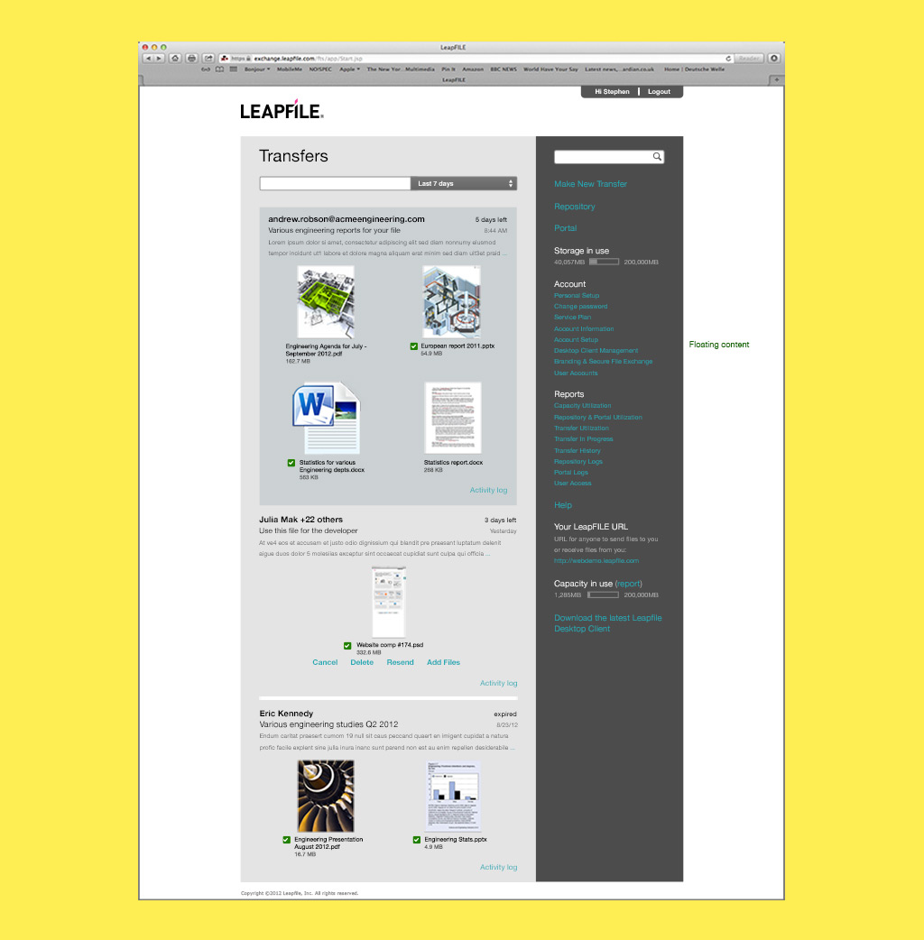 LeapFILE Secure File Transfer Web application. The existing service's dashboard is difficult to find. The goal with this redesign was to make it simpler and display a dashboard so customers know their usage. I coordinated with all stakeholders.